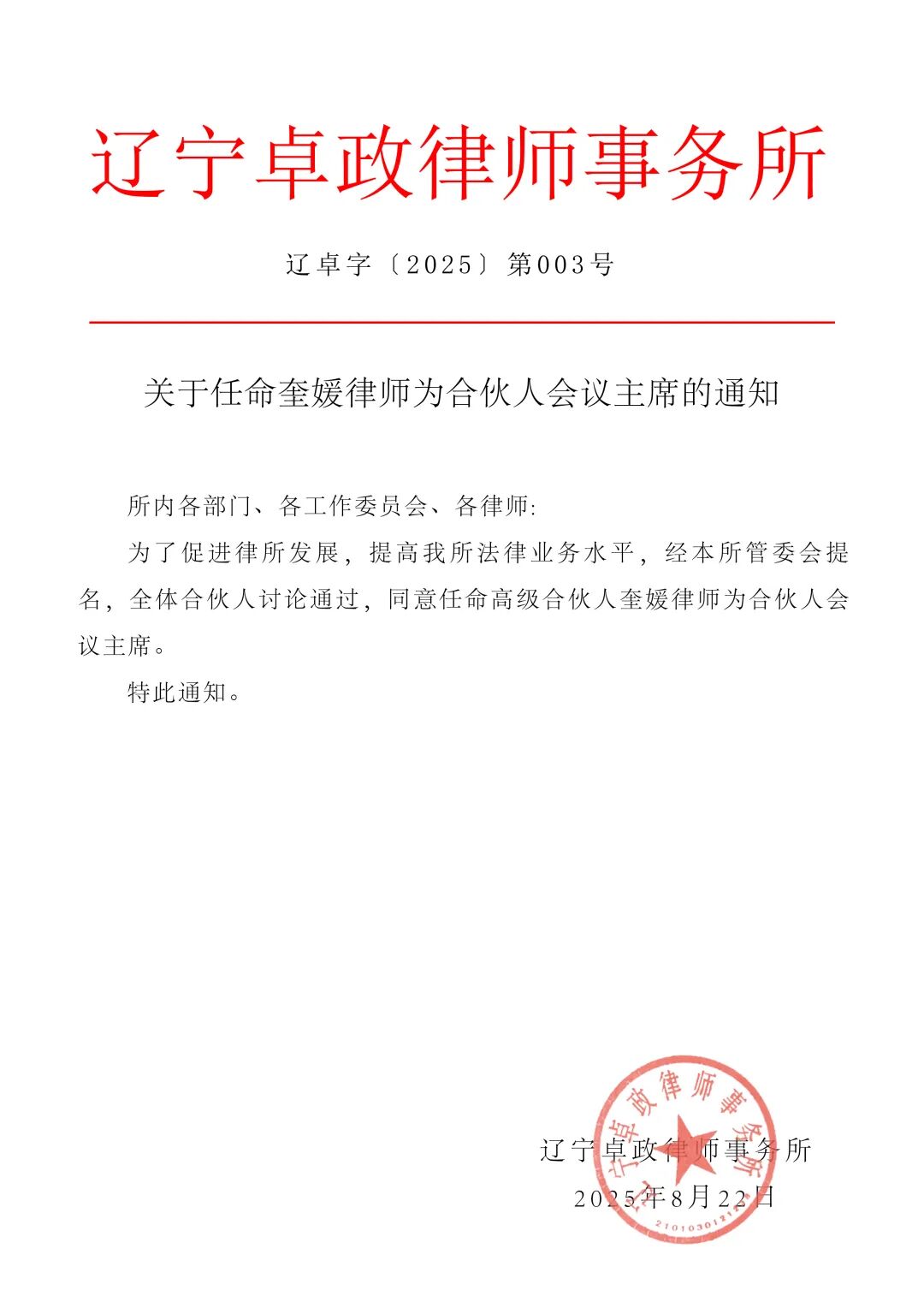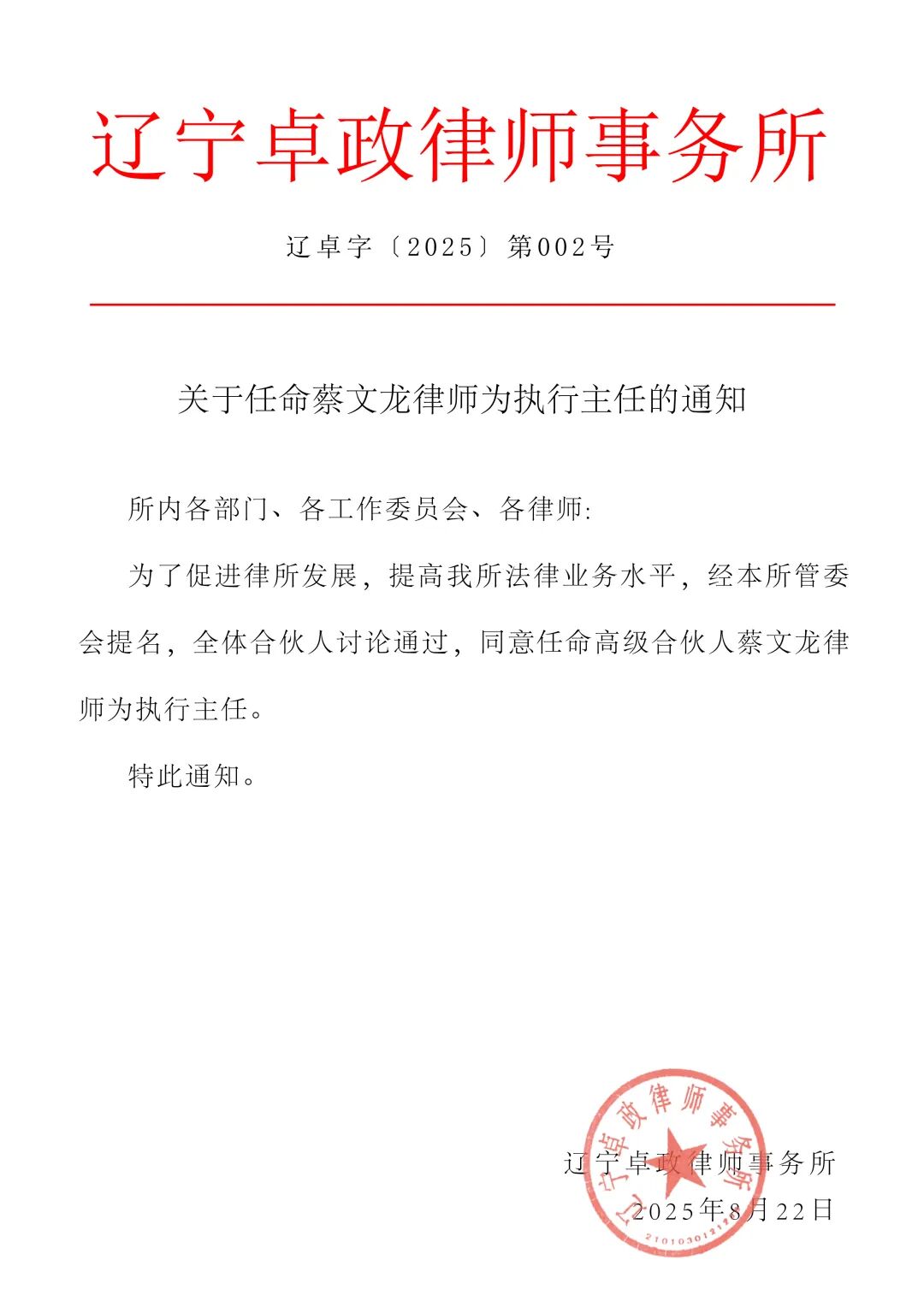 为了促进律所发展,提高我所法律业务水平,经辽宁卓政律师事务所管委会提名,全体合伙人讨论通过会议决议,同意任命蔡文龙律师为本所执行主任,奎媛律师为合伙人会议主席。